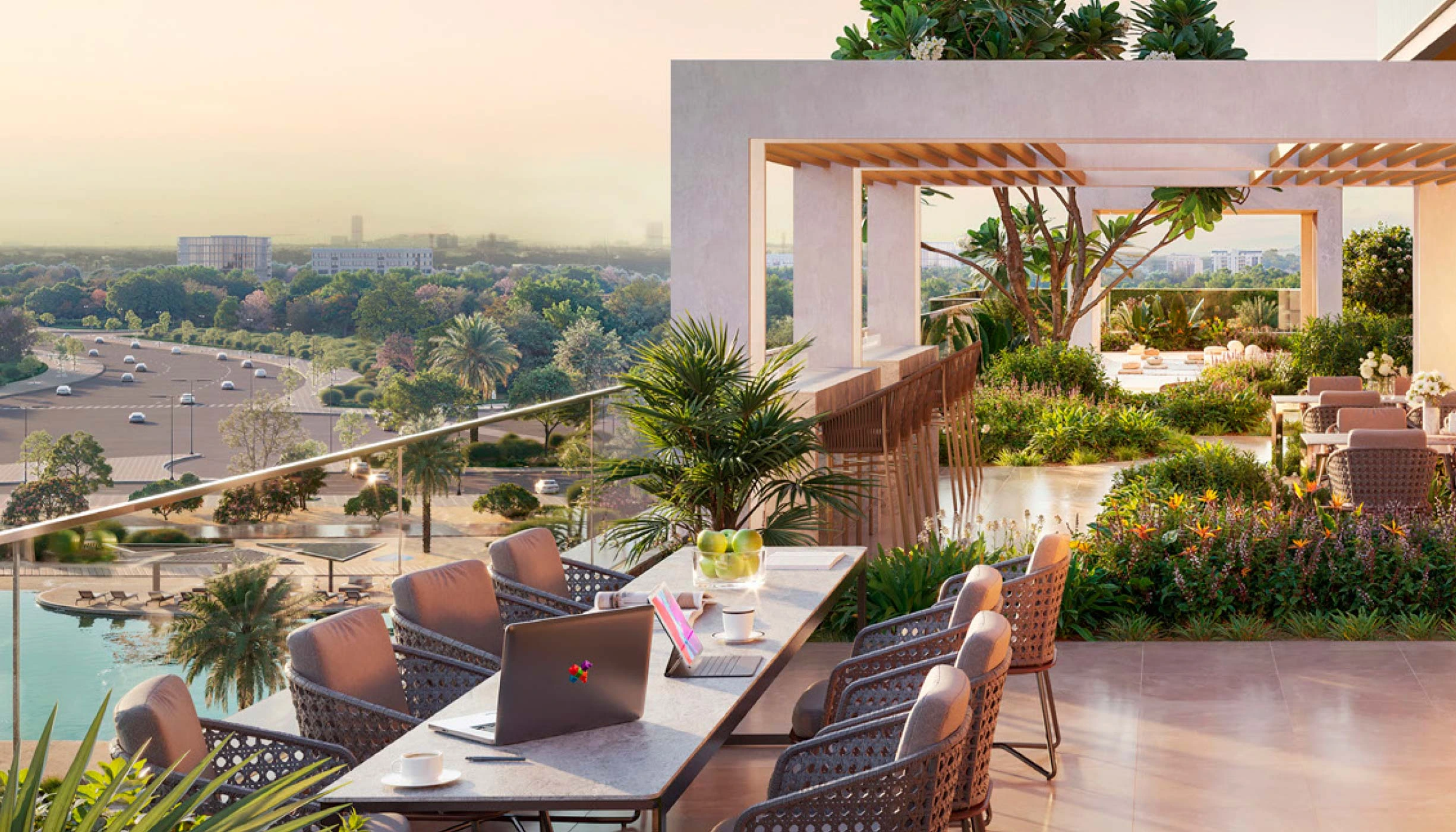 Wellness & FitnessTenants have access to a fitness studio with HIIT lanes, a yoga studio, meditation zones, and spa-quality saunas and changing rooms.